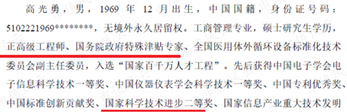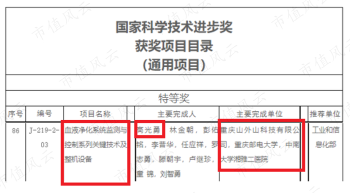 该目录显示,一个名叫“血液净化系统监测与控制系列关键技术及整机设备”的项目获得了二等奖,该项目的第一顺位完成人正是高光勇,主要的完成单位包括山外山血液、重庆邮电大学、中南大学湘雅二医院。
