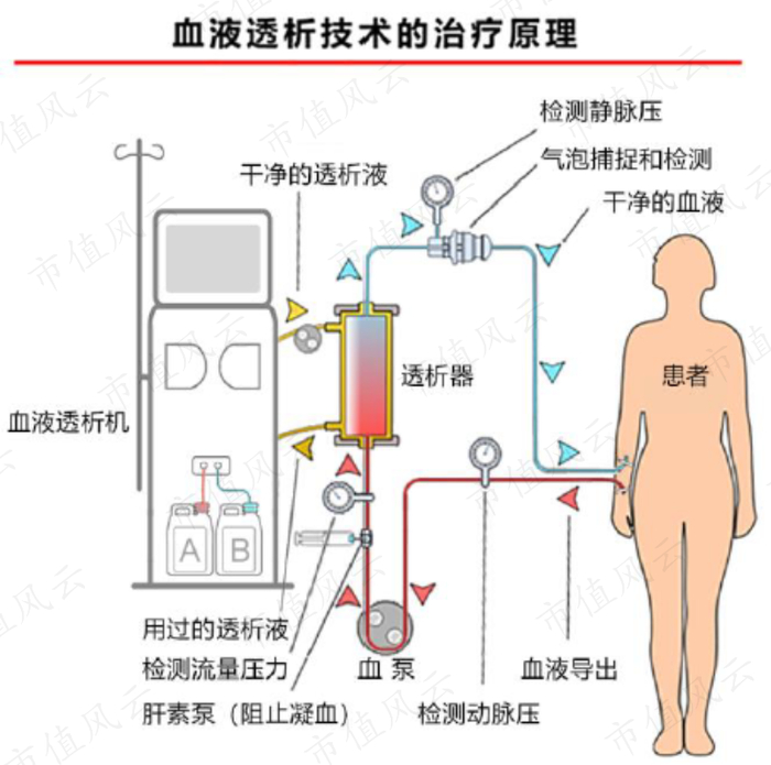 整个透析过程,涉及到的医疗器械和耗材主要有血液透析设备、透析器、水处理设备等。