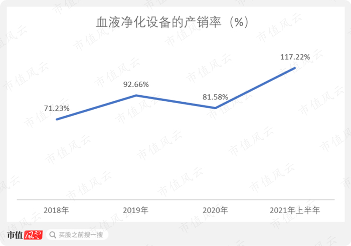 公司整体的血液净化设备产销率从2018年的71.23%增长至2021年上半年的117.22%。