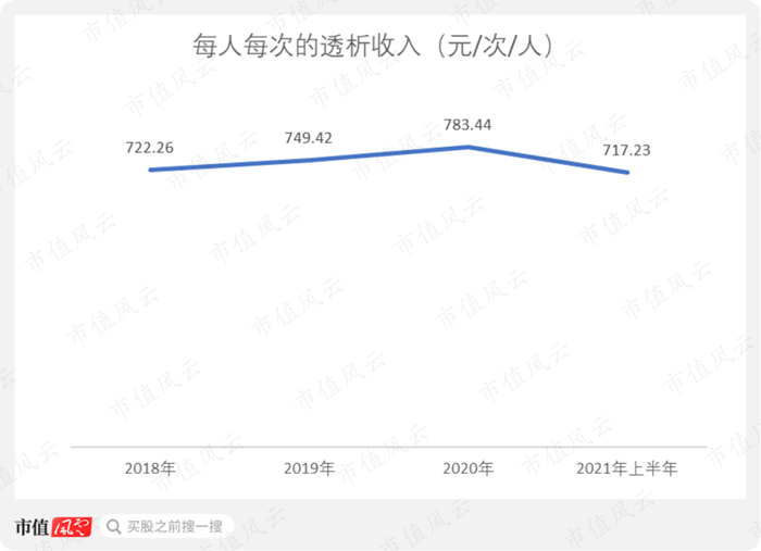每人每次的透析收入从2018年的722.26元增长至2020年的783.44元。也就是说,一个患者到公司的透析中心做一次血液透析,至少要花费700元以上,而且费用还在逐年上涨。