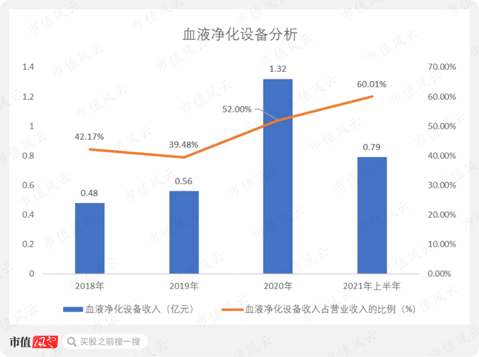 公司血液净化设备收入从2018年的0.48亿元增长至2020年的1.32亿元,2021年上半年达到0.79亿元,血液净化设备占公司营业收入的比例从2018年的42.17%增加至2021年上半年的60.01%。
