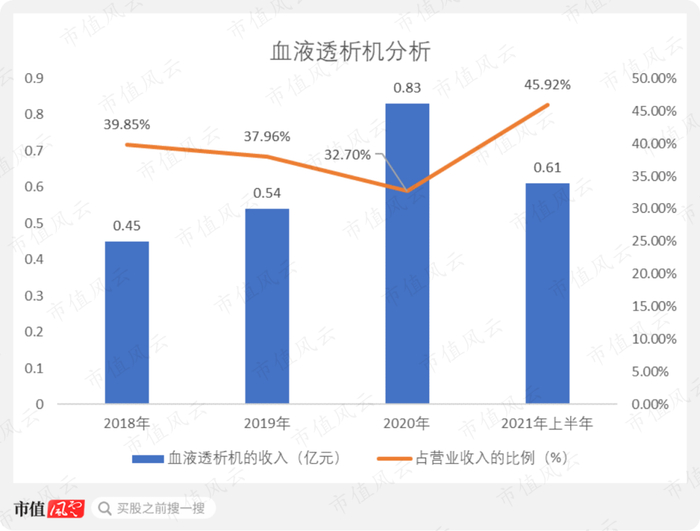 血液透析机收入从2018年的0.45亿元增长至2020年的0.83亿元,2021年上半年的血液透析机的销售收入达到0.61亿元。截至2021年上半年,血液透析机收入占营业收入的比例已经接近50%,血液透析机已成为公司创收的核心产品。