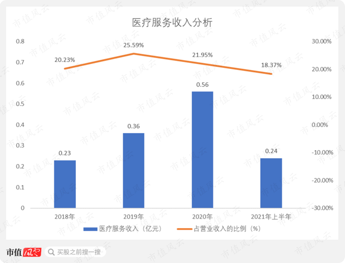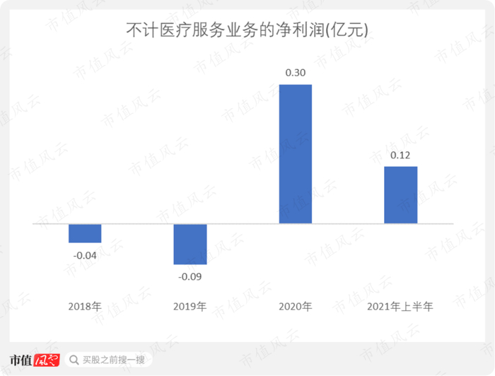 如下图所示,不计医疗服务业务的情况下,公司在2018和2019年的净亏损分别只有0.04和0.09亿元。2020年和2021年上半年的净利润可以分别达到0.3和0.12亿元。