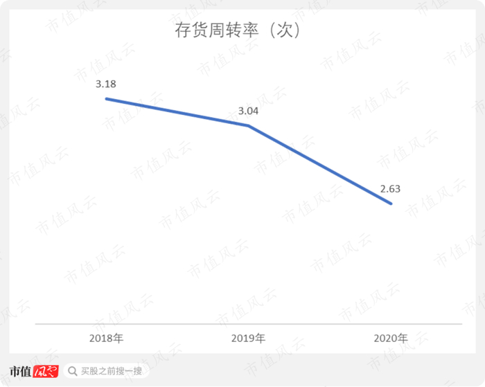 存货规模增加的同时,存货周转率则从2018年的3.18次一路下滑至2020年的2.63次。