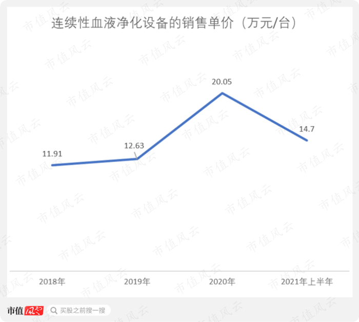 而连续性血液净化设备的销售单价则从2018年的11.91万元/台上涨至2020年的20.05万元/台,2021年上半年的销售单价也有14.7万元/台。连续性血液净化设备不仅比血液透析机卖得贵,而且还有提价的趋势。