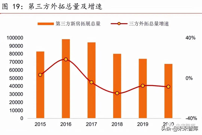 行业第二阶段到第三阶段的转变起点,第三方新房拓展总量下降。以全国商品房销 售面积与百强操盘面积的差值作为第三方新房拓展总量面积,百强以外房企每年销售面 积由峰值 9.8 亿平,下降至 2020 年的 6.7 亿平,相比 2019 年同比下降 8.6 个百分点,物 管企业拓展第二阶段增长点,即第三方新房拓展总量规模有所下降。