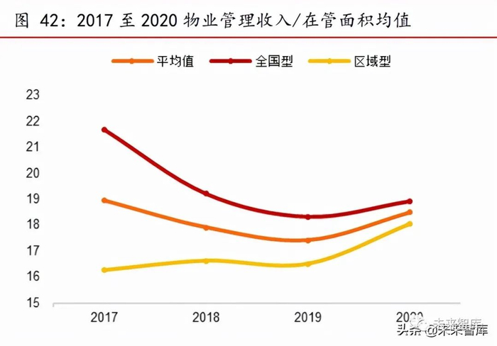 区域型物企人均效能更高,单平米物管收入止跌回升。区域型物企的人均管理面 积为 8.16 平米/人,明显高于全国型物企的 6.42 平米/人。样本物企的单平米物业管理收入在 2020 年止跌回升,由 2019 年的 17.4 元提升到 2020 年的 18.5 元。