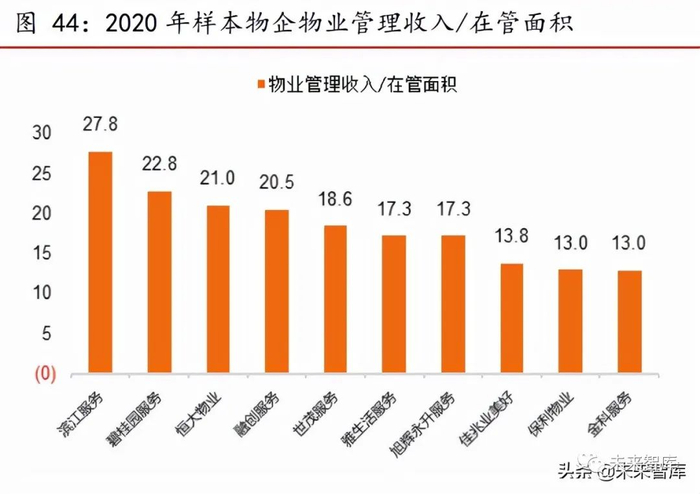 具体物企来看,区域密度大且物业服务定位较低的物企,人均管理面积更高。金科 服务深耕重庆,管理半径相对较小,人均管理面积达到 17.8 平米/人,为样本物企最高。单平米物业管理收入方面,全国型物企保利物业和区域型物企金科服务的单平米物业管 理收入同为 13 元,为样本物企中的最低值。(报告来源:未来智库)