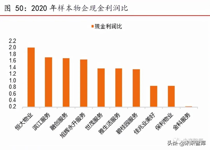 全国型物企利润质量更高。从收入和利润质量的角度看,与 19 年相比,全国型物 企现金利润比基本稳定在 145%,区域型物企下降 24.2 个百分点至 105.9%,全国型物企 的利润质量更高。其中区域型物企金科服务由于相关方金科股份的大量应收款使经营现 金流大幅下降,导致现金利润比降低。
