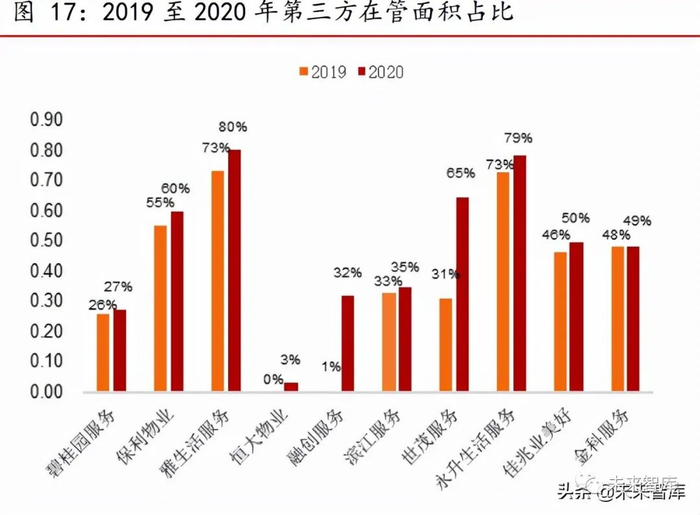 目前行业拓展基本从第一阶段转向第二阶段。第三方在管面积占比加大,一部分 来源是物业企业的收并购,另一部分是市场化招投标的外拓力度加大。新房市场来看, 中小房企愿意引入品牌物管公司管理其物业,以提升产品竞争力促进销售。十家样本物 管企业的平均第三方在管面积比例有所提升,从 2017 年 18.8%提升到 2020 年 48%。