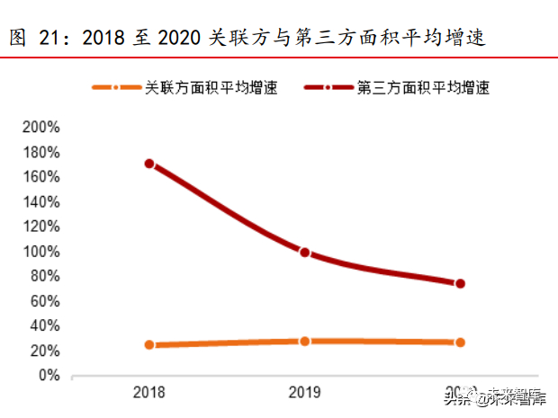 十家样本物管企业数据印证来看,第三方在管面积增速持续下降。关联方在管面 积平均增速整体保持平稳,2018、2019、2020 的增速分别为 25%、28%、27%。第三方 在管面积平均增速从 2018 年的 172%下降到 2020 年的 75%,增速出现大幅度下降 。