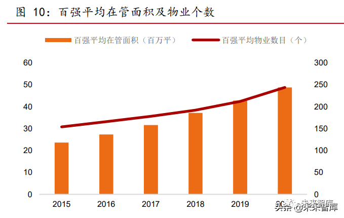集中度提升仍有较大空间。2020 年物业行业总在管面积 259.1 亿平,同比增长 8.2%, 其中百强在管面积 128.8 亿平,同比增长 23.4%,远高于行业增速。百强在管面积的行 业集中度方面,2020 年底达到 49.8%,较 2019 提升 6.3 个百分点;TOP10 集中度达到 10.2%,较 2019 年上升 0.95 个百分点。对比开发企业,2020 年房企 TOP10 市场集中度 为 21.3%,地产百强集中度为 54.4%,目前物管行业集中度对比上游房地产开发行业仍 处于较低水平。随着头部物管企业陆续上市筹集大量资金收并购以扩张规模,同时凭借 良好的口碑,通过招投标外拓中小开发商新盘和存量盘资源,这些因素将促进物管行业 集中度加速提升。