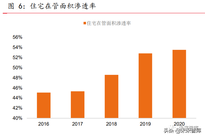 商品房竣工稳定输入。物管行业的增量主要来源于商品房竣工交付和存量盘渗透率 的提升。2016 年以来商品房销售和新开工面积的高速增长,使得施工面积在 2016 年后 保持稳步增长,到 2020 年底全国商品房施工面积创新高,达 92.7 亿平方米。随着后续 竣工面积的逐步释放,将保证未来几年商品房竣工面积维持在每年 9 亿平方米以上,成 为未来行业增量的压舱石。