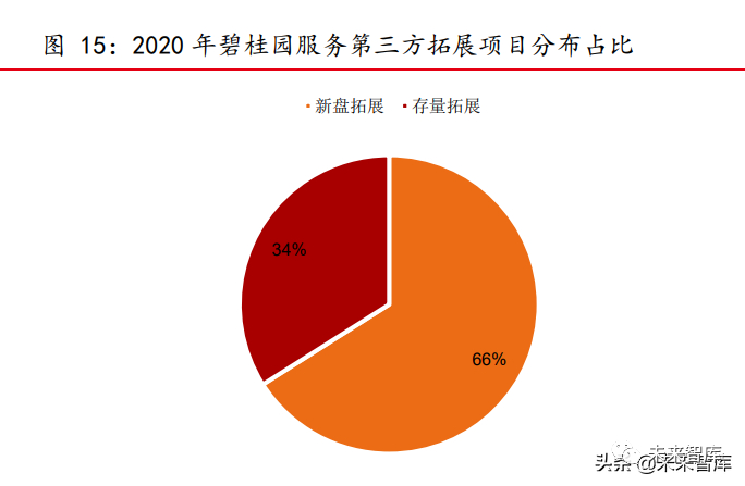 第二阶段为第三方新盘拓展时期,主要对中小开发商新盘拓展,目前处于此阶段。2018 年后随着百强房企的销售面积增速下降,物企为满足持续增长的目标,逐步向第三 方拓展新项目,主要通过与中小开发商签约以及与地方性企业成立合资公司的方式获取 新项目。此阶段第三方新盘拓展面积占比较高,拓展难度相对简单,有一定的不确定性, 项目利润率较高。