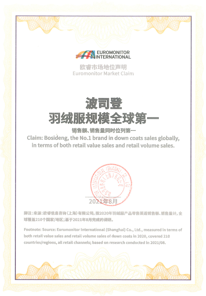 今年8月,全球市场调查机构欧睿国际(Euromonitor)完成了2020年羽绒服产品零售渠道销售额、销售量统计,结果显示,波司登羽绒服规模全球第一,销售额、销售量同时位列第一,这意味着波司登已跻身全球羽绒服市场第一梯队。
