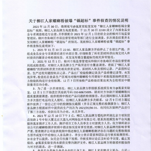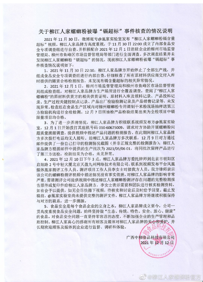 柳江人家螺蛳粉透露,2021年12月1日,柳州市场监督管理局和柳州市鱼峰区市场监督管理局组成检查组,对柳江人家品牌方生产场所进行全覆盖调查,查阅了“柳江人家螺娜粉“的原材料供货方的相关供货证明、原材料入库及领料记录、产品投料记录、生产过程关键控制点记录、产品出厂检验检测记录及产品销售记录等,未发现异常。检查组在食品生产区域内对柳州螺蜘粉专用调制干米粉现场抽样送第三方检验机构进行全检检测。12月7日所抽检产品检验结果出来为全检项目中镉限量项目均合格。