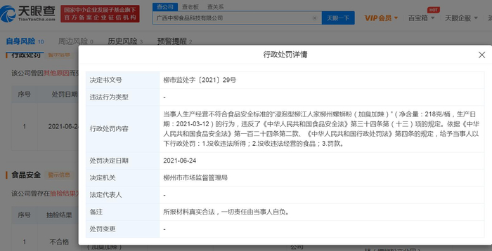天眼查APP数据显示,今年6月24日,柳州市市场监管局曾对广西中柳食品科技有限公司进行处罚。处罚详情显示,当事人生产经营不符合食品安全标准的“浸泡型柳江人家柳州螺蛳粉(加臭加辣)”(净含量:218克/桶,生产日期:2021-03-12)的行为,违反了《中华人民共和国食品安全法》第三十四条第(十三)项的规定。依据《中华人民共和国食品安全法》第一百二十四条第二款、《中华人民共和国行政处罚法》第四条的规定,给予当事人以下行政处罚:没收违法所得、没收违法经营的食品、罚款。(中新经纬APP)