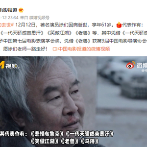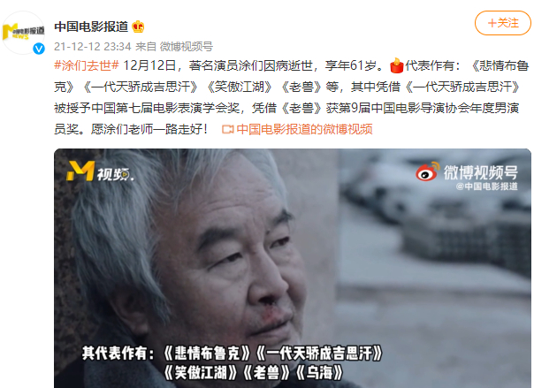 据CCTV6中国电影报道微博消息12月12日,著名演员涂们因病逝世,享年61岁。