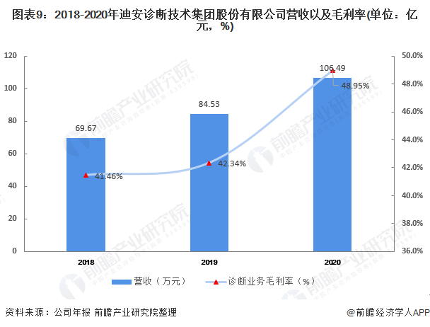 2018-2020年,迪安诊断的业务营收规模呈不断上升趋势,2020年营收为106.49亿元,同比上升26%;2020年,其诊断业务毛利率为48.95%,较2019年有所上升,说明公司盈利能力有所提高。