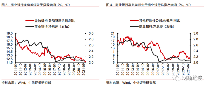 在目前经济增速下行压力显化,实体经济回报率下降,企业经营风险加大的情况下,银行倾向于保守型战略,向风险系数较低的大型国有企业投放贷款。同时银行贷款投放规模也具有顺周期特征,在经济承压的背景下,倾向于主动减少贷款投放。从较长的时间维度看,银行净息差下降通常领先于贷款增速与银行总资产增速,其下降将带动贷款增速于银行总资产增速大幅下滑。