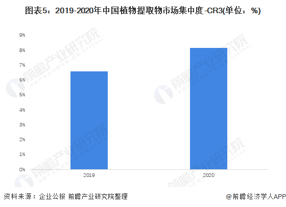 基于上述行业市场份额分析市场集中度情况,得到2019-2020年中国植物提取物行业市场集中度有所上升,CR3由6.58%上升至8.16%,头部企业竞争优势有所增强。