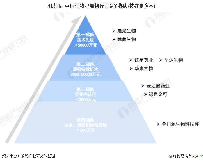 我国植物提取物企业大体上可分为四个梯队,第一梯队包括莱茵生物、晨光生物等A股上市公司,技术先进、规模较大、知名度高;第二梯队包括部分新三板挂牌公司,如岳达生物等,有一定知名度、规模持续扩大;第三梯队包括绿色金可、骄王股份等受到业内认可的企业,其余是相对弱势的第四梯队企业。