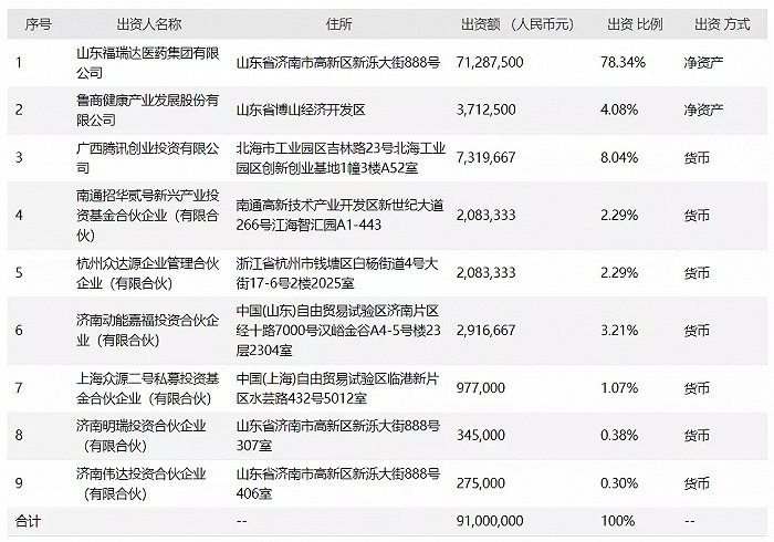 增资完成后,福瑞达生物注册资本增至9100万元,其中,山东福瑞达医药集团持股比例为78.34%,腾讯创业持股8.04%,鲁商发展持股4.08%,济南动能嘉福持股3.21%,南通招华贰号持股2.29%,杭州众达源持股2.29%,上海众源二号持股1.07%,济南明瑞持股0.38%,济南伟达持股0.30%。