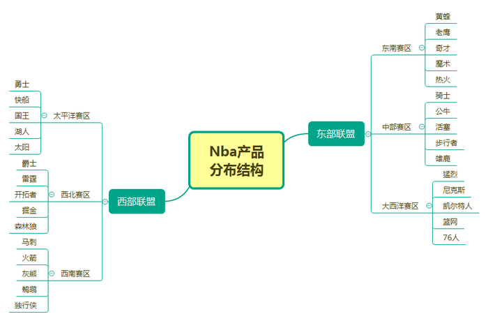 1. 球队数字化:球队30支球队,东西联盟各15支球队,每个联盟又被划分为3个赛区,每个赛区由5支球队组成。