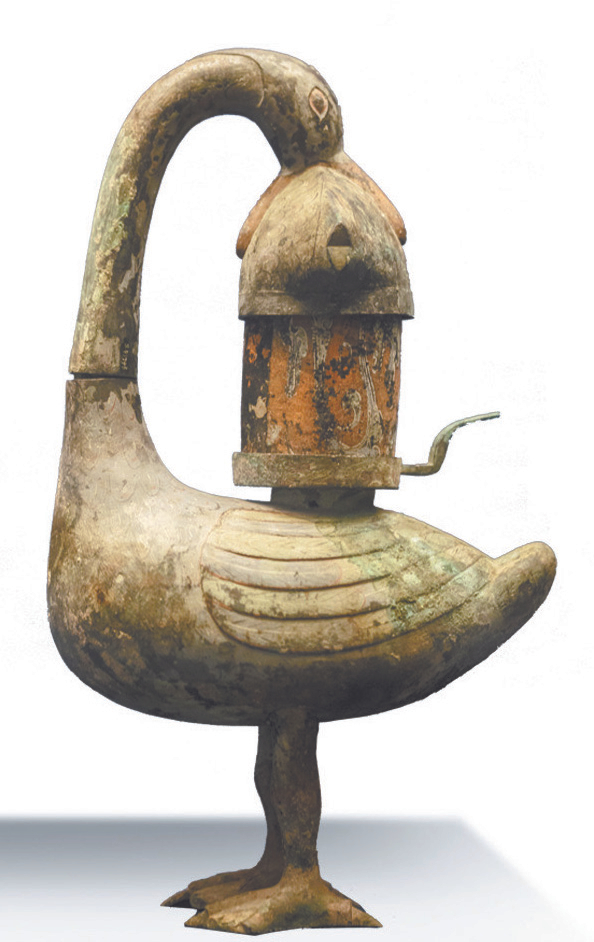 雁鱼铜灯的鱼身、雁颈及雁体中空且相通。当灯火在鱼身内被点燃,烟雾和废气便会上升至雁颈,并进入雁体之中。据史料记载,古人在点燃雁鱼铜灯前,会在大雁的“肚子”里放入少量的清水。燃灯所产生的烟雾、废气在进入雁体后,经过水的稀释作用,会减少或消除对室内空气的污染,这样就实现了铜灯的环保功效。