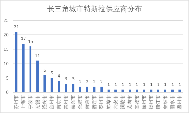 其中,由上海、苏州、宁波、无锡等制造业强市组成的长三角,占据了85家之多的特斯拉供应商数量。