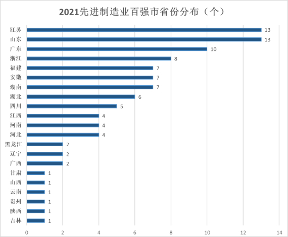 赛迪顾问《先进制造业百强市(2021)》数据,从制造业百强市分布来看,江苏、山东、广东包揽了全国1/3以上的先进制造业百强市,其中,江苏、山东上榜城市最多,均为13个,但江苏是唯一一个全省上榜的省份。