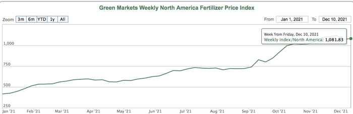 据市场研究机构Green Markets数据显示,截至12日结束的一周,北美化肥价格周指数已升至1081.83美元/吨,是年初价格约的2.6倍。其中,今年尿素、磷酸二铵价格也都翻了一倍,且位于十年高位。