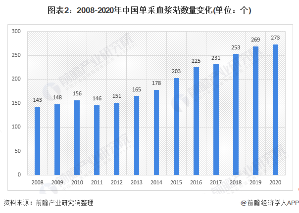 2000年我国血浆站有240个,2001年急剧下降为180个;2011年,贵州省卫生厅发布《贵州省采供血机构设置规划(2011-2014)》,拟关停16个血浆站,使血浆站数量下降至146个;2012年华兰生物重庆站、河南站等相继建设,使血浆站数量上升至151家;2014年,华兰生物于9月23日滑县单采血浆站获到采血许可证,沃森生物魏县和栾城建设完成,使血浆站血浆达到178家。2008-2020年我国单采血浆站整体呈增长态势,2020年达到273个,同比增长率仅为1.5%。