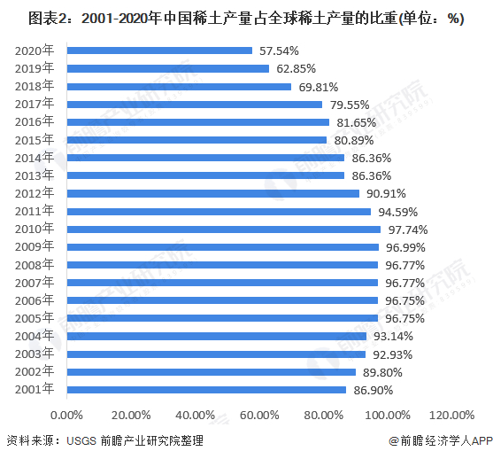 中国是世界上稀土资源最丰富的国家,全国已有22个省(区)先后发现一批稀土矿床,主要分布在内蒙、江西、广东、广西、四川、山东等地。同时中国的稀土矿产量也占据了全球的绝大一部分。2020年世界稀土产量24.33万吨,其中,中国稀土产量14万吨(生产配额,不包括无证生产),占比近58%,占比逐年下降的主因一方面是因为美国、澳大利亚等国加大了稀土的开采与出口,另一方面是由于我国稀土产业逐步从“量大低质”向精细化、高纯化等方向转型。2001-2020年,中国稀土产量占据全球稀土产量的比重均保持在55%以上,说明了我国稀土产业在全球的重要地位。