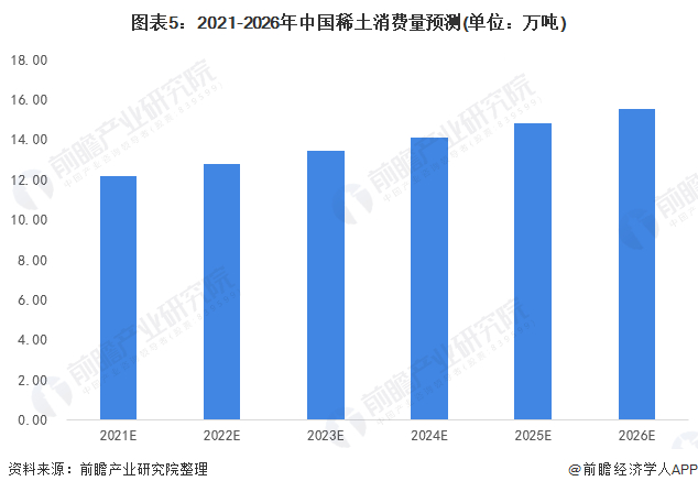 自2005年以来,我国稀土消费量超过了世界总消费量的50%。同时随着新能源汽车、永磁电机等对中国稀土的需求,未来中国稀土需求仍将会有持续攀升的可能。预计2019-2024年间,我国稀土消费规模将保持5%的增长势头,预计到2026年,中国稀土需求将达15.5万吨。