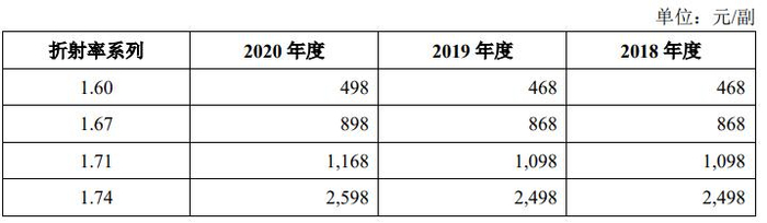 镜片是眼镜的核心部件。根据折射率,镜片可以分为1.56、1.60、1.67、1.71等常用规格。直观来说就是:相同近视度数下,镜片的折射率越高,眼镜越“轻薄”。数据显示,明月镜片对折射率1.67以上,尤其是1.71折射率镜片的外购依赖度很高。