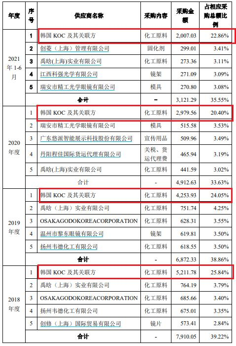 据《招股书》披露,2018年至2021年6月,明月镜片向韩国KOC及其关联方采购1.67及以上折射率树脂单体,占该公司当期耗用的该类树脂单体金额的100%。该公司也承认:“对外采购的原料来源较为集中,且对韩国KOC及其关联方存在一定程度的依赖。”