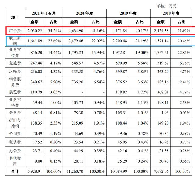 《招股书》显示,2018年-2020年,明月镜片销售费用分别为7682万元、1.03亿元和1.12亿元,占到了营收的五分之一。而在销售费用中,广告费是绝对的大头。