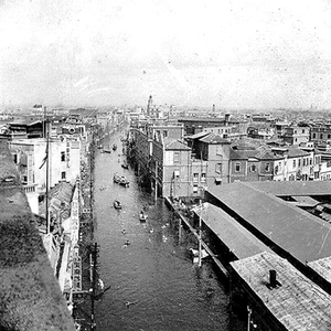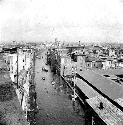大丸百货店很有故事。1928年之前这里还是一块空地,院内杂草丛生。从1939年天津大水时期的照片来看,旭街23番这个地方有两组建筑,靠北一侧围墙内是大棚式的仓储建筑(见图)。1939年底,大水还没完全退去,就传出大丸要在中原公司对过盖房的消息,且雄心勃勃表示和中原公司一争高下。