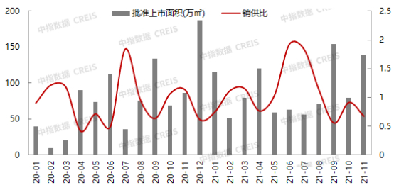 供应端:新房供应节奏加快,项目开盘去化率较低。从预售取证来看,本月新房取证入市有所加快。11月北京新取证16个项目,较上月增加2个。从取证项目分布来看,新批项目主要集中在通州、怀柔、密云等郊区,其中通州和怀柔推出房源数均超1000套。新开盘方面,本月监测的重点新开盘项目去化效果一般,整体去化率仅33%。同时项目分化明显,萬橡悦府、海开·圆明天颂等项目去化率较高,而部分项目去化率仅在30%左右。11月,北京商品住宅新增供应规模138.19万平,环比增长74.5%。2021年1-11月,北京商品住宅(不含保障房)新增供应规模985.61万平,同比增长32.4%;比2019年同期增长25.7%,两年平均增长29.0%。销供比方面,2021年1-11月,北京商品住宅市场销供比为0.94,同比上升0.13个点,整体处于供求弱平衡状态。