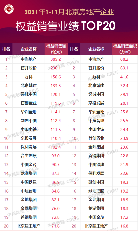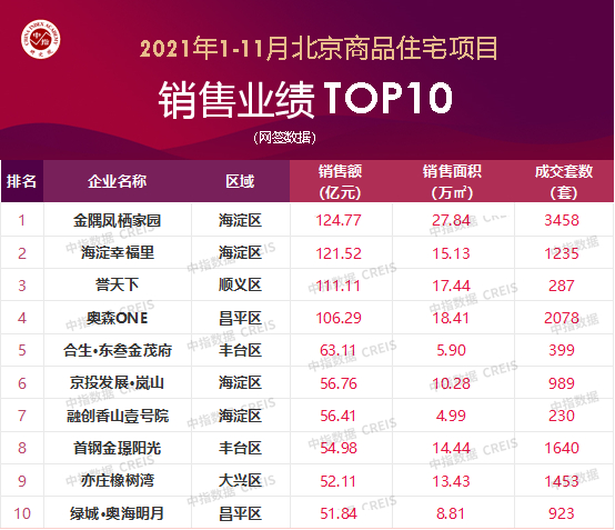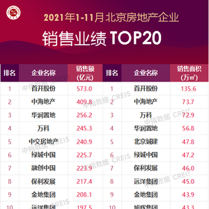 特别声明:北京房地产企业销售数据统计是以2021年1月1日-11月30日期间北京签约的商品房(不含保障房)为统计口径,主要依据中指数据CREIS(点击试用)在北京全市的监测数据,并参考当期总体经营情况和推盘去化情况进行分析统计;对于少数没有在监测范围内的项目,由企业提供相关证明文件,经课题组对数据进行严格审核,也纳入统计范围。本报告仅供参考,课题组不对使用报告及其内容所引发的任何直接或间接损失承担责任。