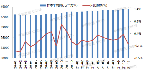 成交价格:新房价格总体平稳,环比略有下降。2021年11月,北京新建住宅平均价格由涨转跌,平均价格为44317元/平方米,环比微降0.02%;同比上涨1.81%,涨幅收窄0.55个百分点。1-11月,北京新建住宅价格累计上涨1.75%,较去年同期扩大0.18个百分点。