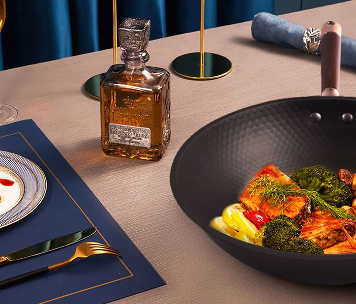 这种像蜂巢一样的纹理,沿用的日式槌目纹,可是由专业工匠一锤一锤锻打出来的,凹槽部分还能很好地储存炒菜的油,起到润滑作用。