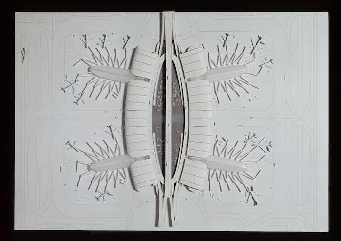 拉德芳斯大拱门是这座巴黎卫星城市的标志,也可以被视为大巴黎地区规划改造中的一个“纪念碑”。展览“巴黎建筑”展出了“大拱门”的模型与照片,它位于巴黎著名的历史轴线西侧末端,于法国大革命200周年之际开放,与老凯旋门遥遥相望。这是一座属于20世纪的凯旋门,建筑采用钢筋混凝土框架,外表覆盖着玻璃与意大利卡拉拉的大理石。为了调和其大尺度带来的空旷感,建筑师在里面设计了一个张拉膜做的顶篷,让整个空间与人更为亲近。