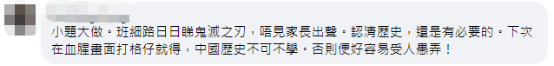 而看到家长的投诉后,也有网友表示,“班细路(小孩)日日睇(看)《鬼灭之刃》(日本漫画作品),唔(不)见家长出声。认清历史,还是有必要的。下次在血腥画面打格仔(马赛克)就得,中国历史不可不学,否则便好容易受人愚弄!”