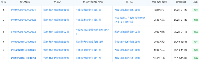 除此之外,黄河大观还热衷于通过股权出质来募集资金,在这一过程中,百瑞信托扮演了“金主”角色。作为出质人,黄河大观共有6笔股权出质,其中3笔质权人是百瑞信托,共计出质股权数额达1.83亿元。