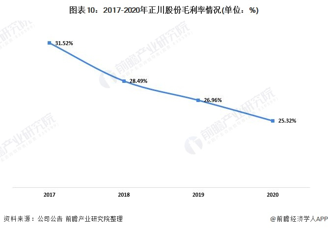 2017年以来,正川股份的毛利率逐年下降。2020年度,公司硼硅玻璃管制瓶业务的毛利率下降主要是因为硼硅玻璃管制瓶销售价格下降所致;瓶盖业务的毛利率下降主要系2020年公司加大化妆品包装市场开拓力度,一方面给予价格优惠,另一方面公司需要新研发和生产化妆品瓶盖,而新的化妆品瓶盖的生产需要使用更高精度设备和新模具,且良品率有待一段时间的工艺改进提升,新瓶盖产品的单位成本相对较高,两个因素导致新瓶盖产品的毛利率会相对较低,拉低了公司瓶盖业务的毛利率。