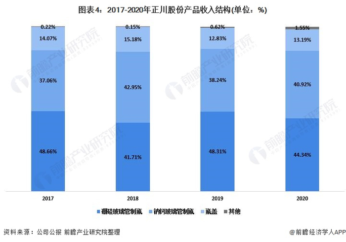 从目前正川股份的产品布局结构来看,公司的产品主要以玻璃管制瓶为主,含硼硅玻璃管制瓶和钠钙玻璃管制瓶。2020年公司硼硅玻璃管制瓶收入2.22亿元,占总收入的44.34%;钠钙玻璃管制瓶收入2.05亿元,占比40.92%。