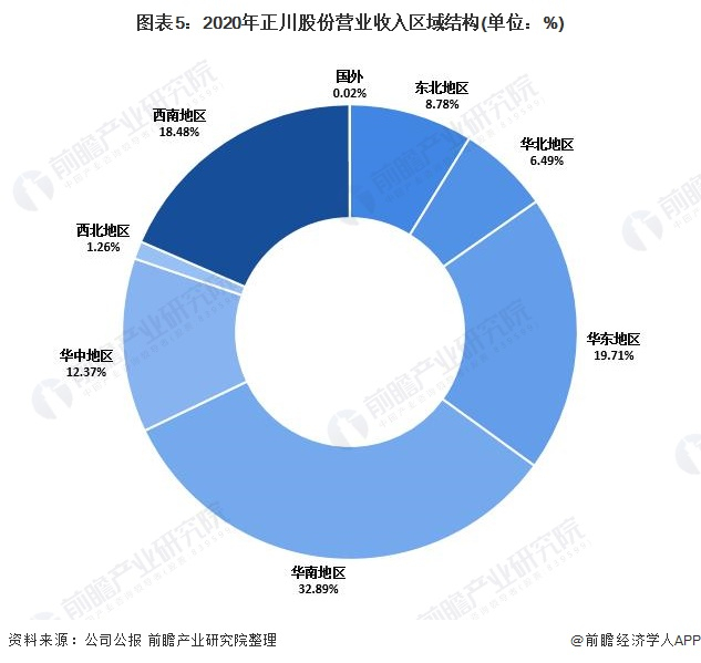 正川股份的销售基本在国内,国外销售占比非常少,其中国内又以华南地区为主,主要系公司主要客户无限极(中国)有限公司、国药集团致君(深圳)制药有限公司以及广州医药进出口有限公司等均属于华南地区。2020年公司华南地区收入1.65亿元,占比32.89%。