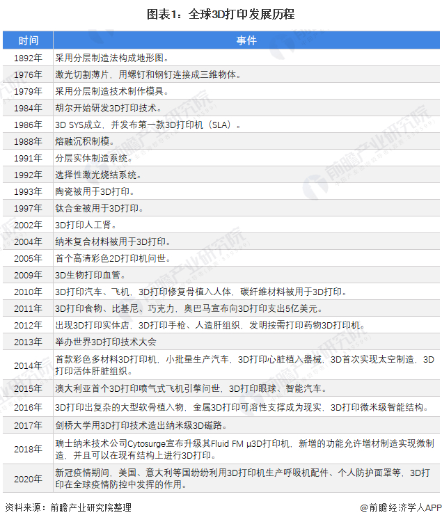 3D打印技术最早可以追溯到1976年喷墨打印机的发明。20世纪80年代以后,3D打印行业受到国内外的广泛关注,各种3D打印技术也在多个行业应用并发展。目前已覆盖了制造、医疗、教育、航空航天、军事等多个领域。全球3D数字化和3D打印技术仍处于成长期初期。